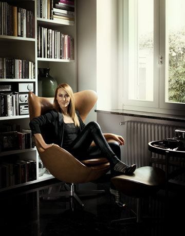 Frida sits in an Arne Jacobsen Egg Chair in her study.