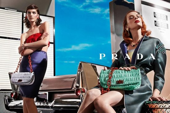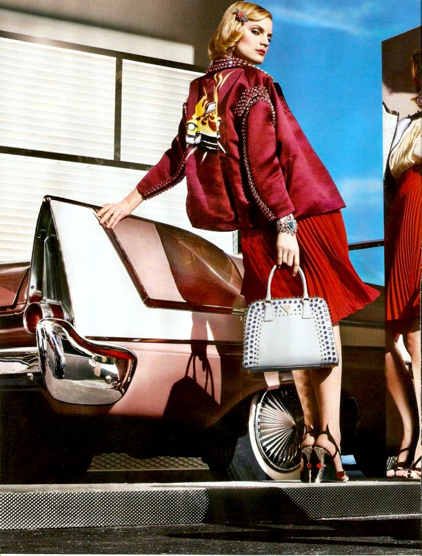 02 . 04 . 12Leave it to an Italian to create a collection inspired by hot rods and American in the 1950’s. Spring 2012 at Prada would make a Pink Lady proud. Not sure if I will be wearing those sandals with flames on them but I might have to have one of those new handbags. Bon Weekend!