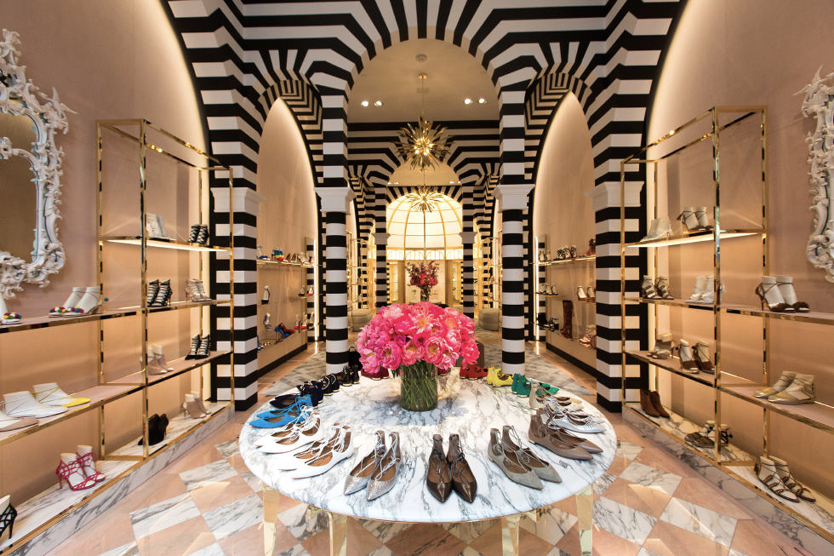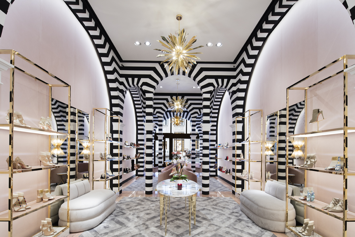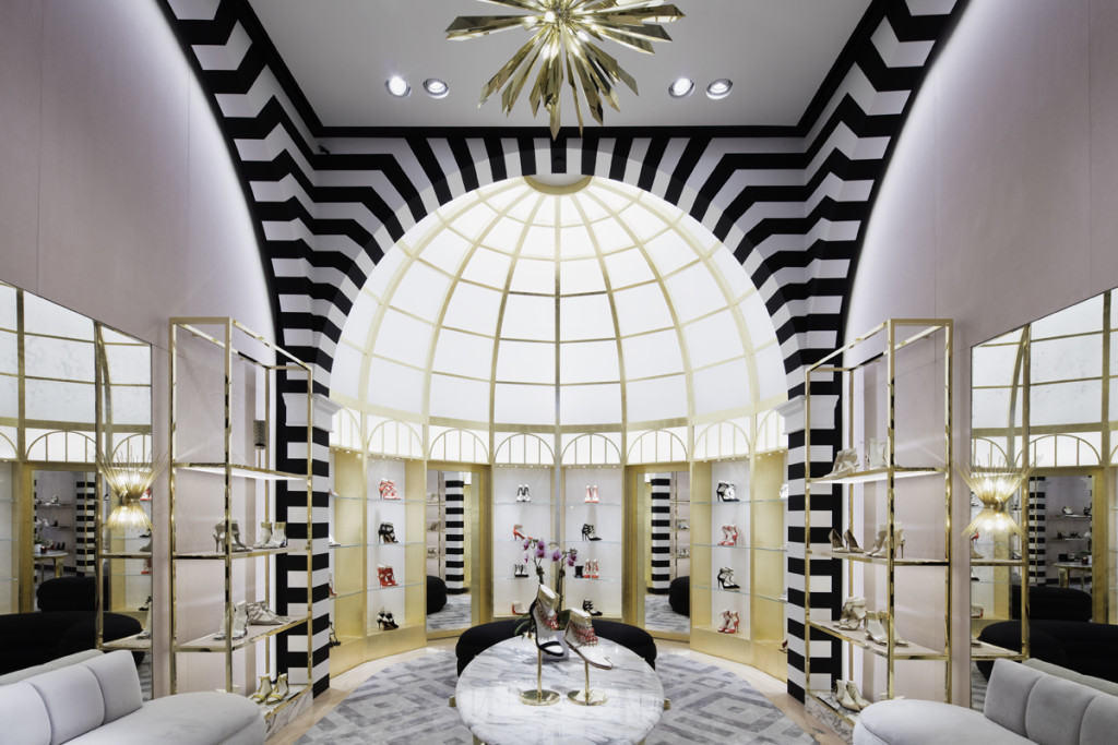 The store mixes many different patterns and materials such as marble, brass, and suede, that all manage to work together perfectly. The brand’s signature black and white stripes were inspired by the Basilica of Santa Maria Novella in Florence and creates a “Church of Shoes” at 939 Madison Avenue that looks like heaven to me.